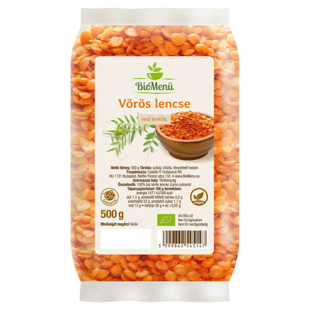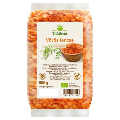 100 % organska rdeča leča (Lens culinaris); Alergeni: lahko vsebuje sledi glutena in sezamovih semen