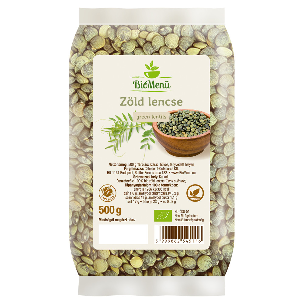 100 % organska zelena leča (Lens culinaris); Alergeni: lahko vsebuje sledi glutena, gorčičnih semen in sezamovih semen.