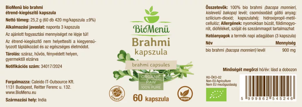 100 % organski listi brahmija (bacopa monnieri, drobnolistna bakopa); sredstvo proti sprijemanju: silicijev dioksid; ovojnica kapsule: hidroksipropil metilceluloza; Alergeni: lahko vsebuje sledi pšenice, arašidov, oreščkov, soje in sezama.