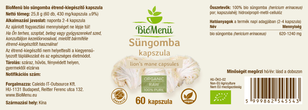 100 % organski prah gobe ježka (Hericium erinaceus); ovojnica kapsule: hidroksipropil metilceluloza