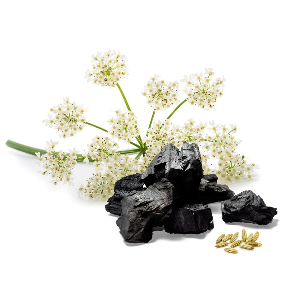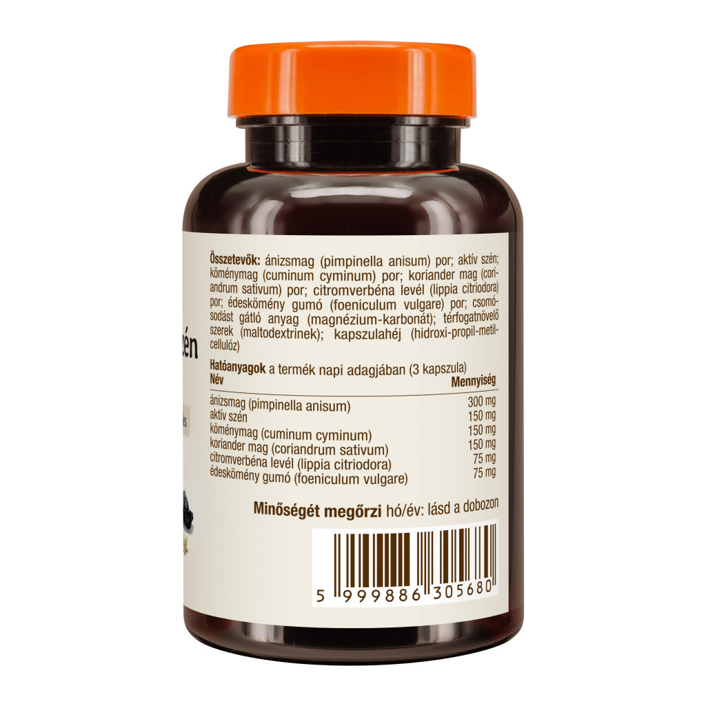 prah janeža (pimpinella anisum); aktivno oglje; prah kumine (cuminum cyminum); prah koriandra (coriandrum sativum); prah listov limonine sporiš (lippia citriodora); prah gomolja komarčka (foeniculum vulgare); sredstvo proti sprijemanju (magnezijev karbonat); sredstva za povečanje prostornine (maltodekstrini); ovojnica kapsule (hidroksipropil metilceluloza).