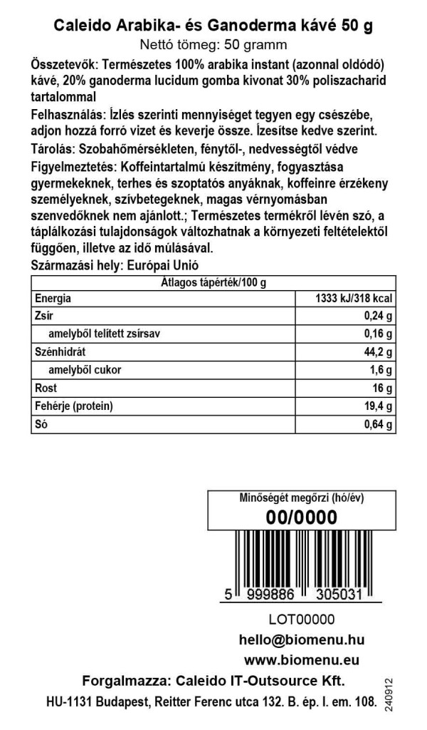 Kava Caleido Arabica in Ganoderma vsebuje 100 % ekološko pridelano instant kavo iz pravične trgovine in 20 % gob Ganoderma Lucidum s 30 % vsebnostjo polisaharidov. Odličnega je okusa in pozitivnih fizioloških učinkov na telo.