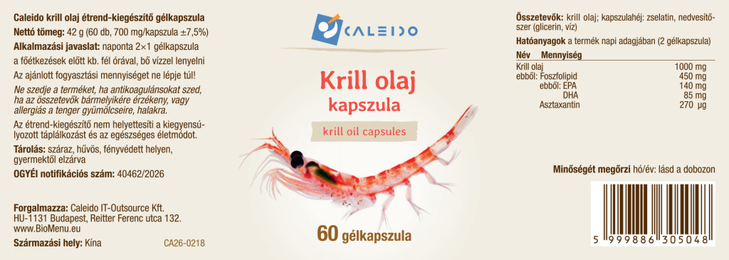 krilovo olje 1000 mg, od tega fosfolipidi 450 mg, od tega EPA 140 mg, DHA 85 mg, astaksantin 270 µg