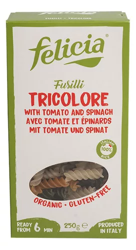 Zvite testenine fusilli, okrašene z veselimi italijanskimi barvami, so priljubljene med otroki. Hranljive in okusne so idealne za pripravo katere koli testeninske jedi. Testenine Felicia so družinska specialiteta italijanskega podjetja Molino Andriani. Njihovi izdelki brez glutena so narejeni s strokovnim znanjem in strastjo, njihove visokokakovostne sestavine pa so skrbno izbrane in obdelane nežno. To je razlog za to posebno, 100 % organsko, brezglutensko ponudbo.